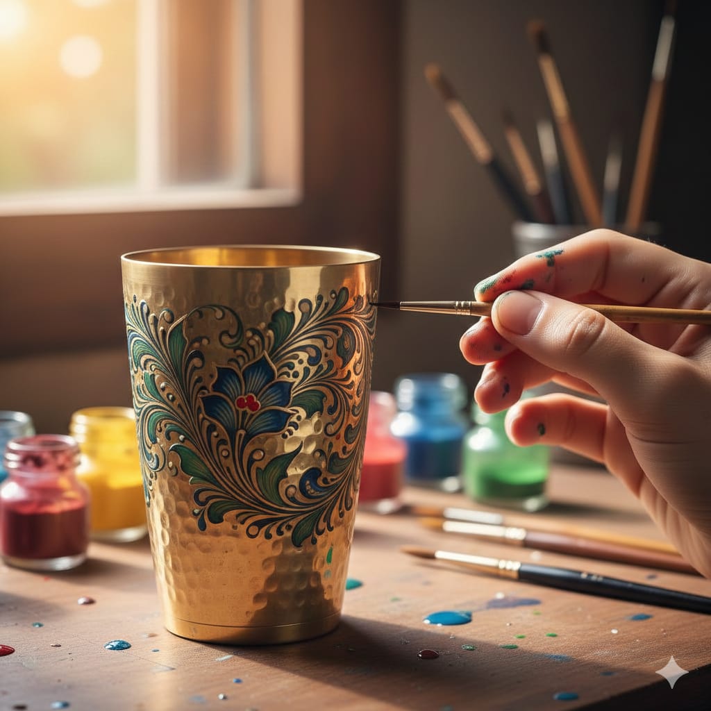 Elevate your daily hydration ritual with a touch of heritage. Each of our brass glasses is a canvas, individually hand-painted by skilled artisans using vibrant, non-toxic enamel. Featuring intricate [Insert Pattern, e.g., Mughal floral/Mandala] designs, no two pieces are exactly alike. Beyond its beauty, drinking from brass (an alloy of copper and zinc) has been a cornerstone of Ayurvedic wellness for centuries. These glasses aren't just drinkware; they are functional pieces of art that bring a regal, bohemian soul to your dining table.